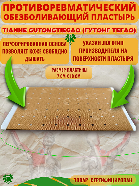 Пластырь Tianhe Gutong TieGao - уникальный по своему составу и воздействию на организм человека продукт, полученный с применением возможностей самых современных фармацевтических эко - технологий на основании тысячелетиями проверенных рецептов китайской народной медицины.