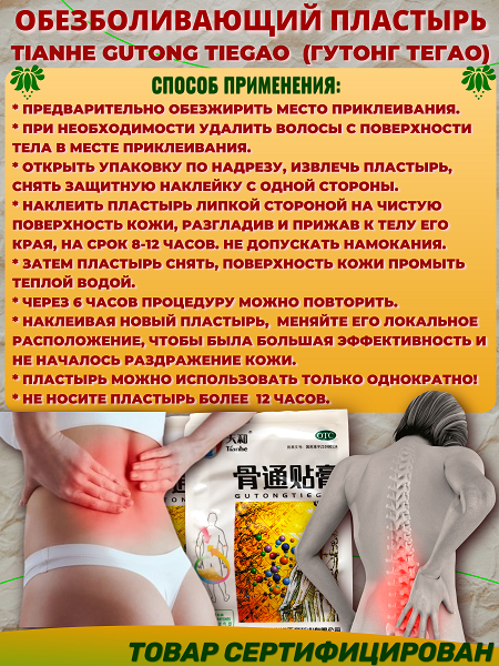 - Пластырь Tianhe Gutong TieGao наклеивается на проблемные участки тела.