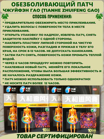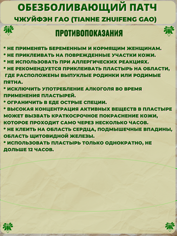Рекомендации по применению китайского пластыря Тяньхэ Чжуйфэн Гао