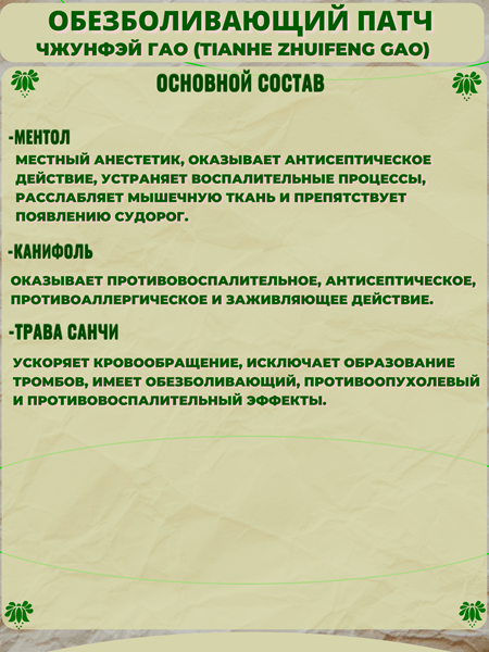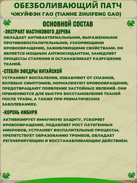 Состав китайского ортопедического пластыря Тяньхэ Чжуйфэн Гао: